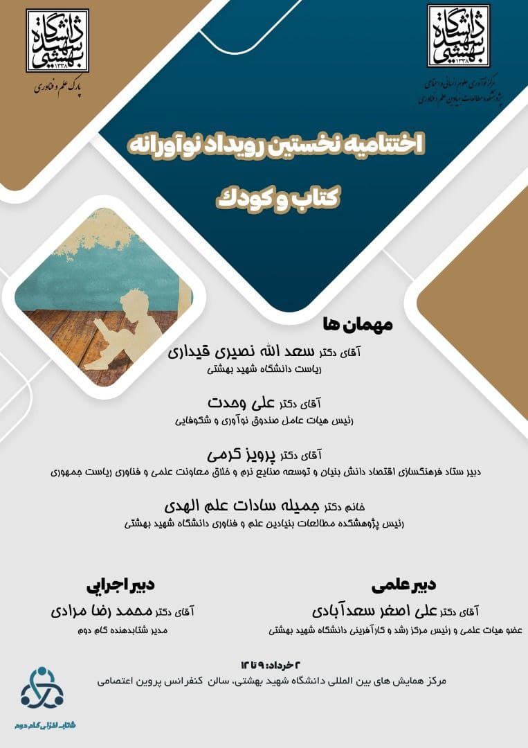 اولين رويداد نوآورانه كتاب و كودك طی مراسمی با حضور دکتر وحدت رييس صندوق نوآورى و شكوفايى، دكتر كرمى رييس ستاد توسعه فرهنگ، علم ،فناورى و اقتصاد دانش بنيان،دكتر نصيرى رييس دانشگاه شهيد بهشتى و جمعى از مديران و مسئولان دانشگاه و اكوسيستم نوآورى روز يكشنبه ٢ خرداد به كار خود پايان ميدهد.