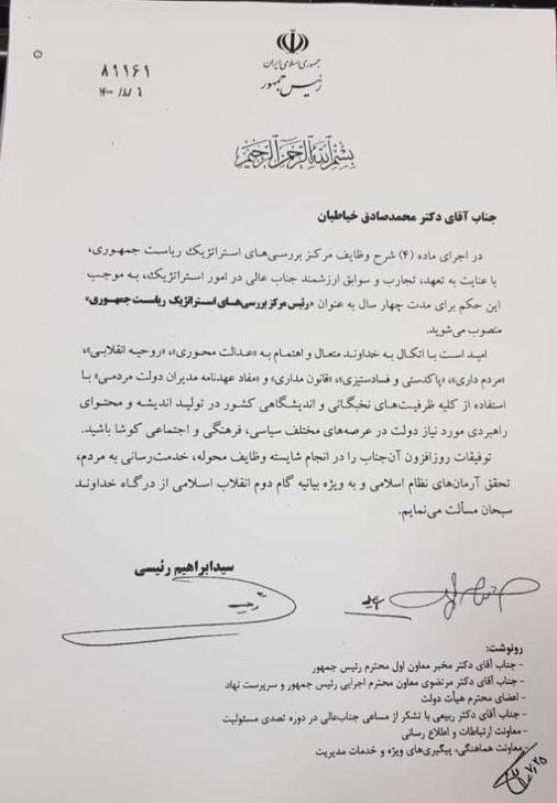 با حکم رئیس جمهور رئیس جمهور (( دکتر محمد صادق  خیاطیان)) عضو هیئت علمی دانشگاه شهید بهشتی به عنوان رئیس مرکز بررسی های استراتژیک انتخاب شد.