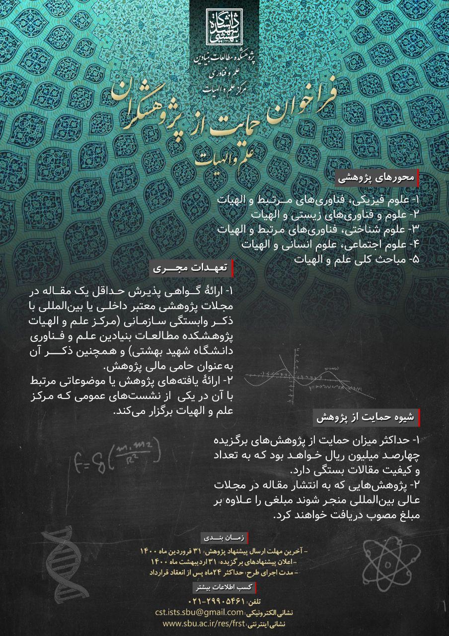 مرکز علم و الهیات پژوهشکده مطالعات بنیادین علم و فناوری دانشگاه شهید بهشتی قصد دارد برنامۀ پژوهشی – آموزشی – ترویجی جامعی را در حوزۀ علم و الهیات اجرا کند. هدف از اجرای این برنامه تلاش برای فهم بهتر از نسبت علم و الهیات، خصوصاً رابطۀ علوم با الهیات اسلامی، از طریق انجام پژوهشهای ممتاز و همچنین ترویجِ کاوش دربارۀ نسبت علم و الهیات در حوزۀ عمومی است. از همینرو، فراخوان حاضر از تمامی پژوهشگران این حوزه دعوت میکند پیشنهادهای پژوهش خود را با در نظرگرفتنِ موارد ذیل به دفتر مرکز علم و الهیات به نشانی الکترونیکی cst.ists.sbu@gmail.com ارسال کنند.